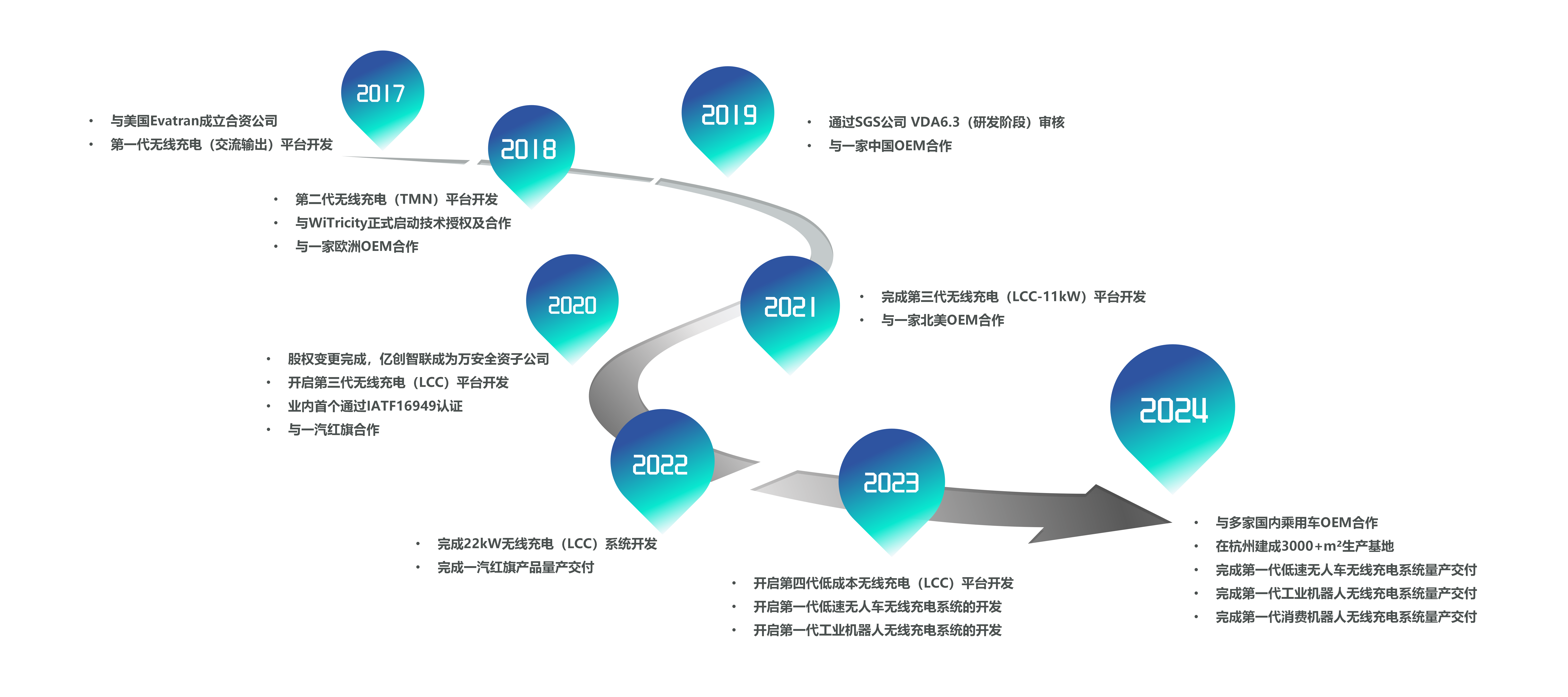 亿创智联(浙江)电子科技有限公司由知名汽车零部件企业万安集团投资设立,总部位于浙江省杭州市,并在上海市浦东新区设立研发中心。亿创智联是一家专注于中大功率无线充电产品开发的国家级高新技术企业,公司产品在新能源汽车、低速无人车、工业机器人、消费机器人等领域已实现产业化。